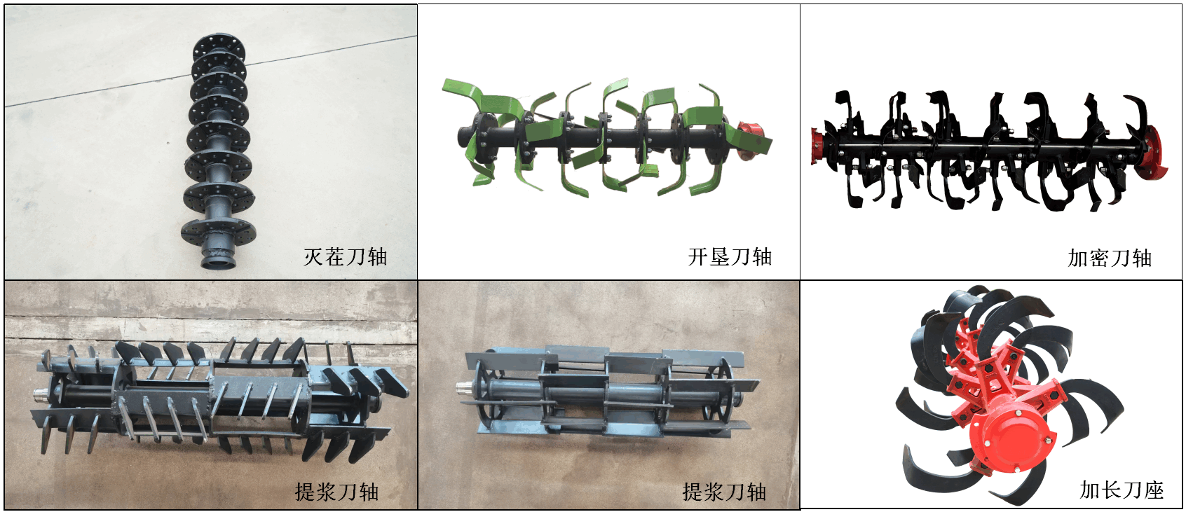可根據水旱田及農藝需要配制:滅茬刀軸、開(kāi)墾刀軸、加密刀軸、提漿刀軸、加長(cháng)刀座