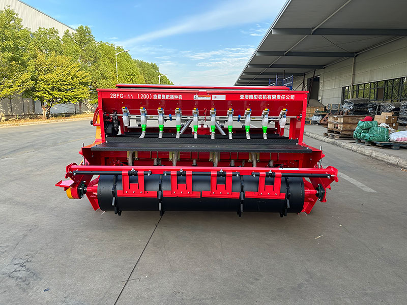 2BFG系列旋播機的耕作部件是由動(dòng)力驅動(dòng)其刀軸旋轉,使刀片對土壤進(jìn)行切削并將需播種區域的土壤切下后拋,與此同時(shí)由鎮壓輥驅動(dòng)排肥器排出肥料落入整體排肥槽,撒入前邊未耕地面,由旋耕機工作時(shí)攪入土層,由鎮壓輥驅動(dòng)后面小麥排種器,排出種子經(jīng)前后錯行排列,寬幅圓盤(pán)開(kāi)溝器按一定農藝要求插入土層,并被落下的碎土覆蓋,一次完成開(kāi)溝、滅茬、(整地)、施肥、播種、覆土、 鎮壓等多項農藝要求。