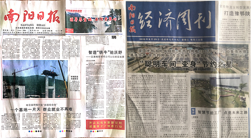 從智能制造到清潔生產(chǎn)、節能減排,一月內《南陽(yáng)日報》于8月11日、、8月29日連續兩次報道亞澳農機,河南衛視《新聞聯(lián)播》聯(lián)動(dòng)報道。