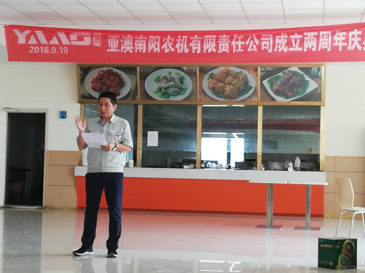 中秋佳節至,周年慶歡喜。2018923日,亞澳南陽(yáng)農機有限責任公司開(kāi)業(yè)兩周年慶典暨歡度中秋佳節活動(dòng)在公司餐廳隆重舉行,因當天有生產(chǎn)任務(wù),在不耽誤生產(chǎn)及各部門(mén)班組的全力配合下,慶典活動(dòng)在中午12:00順利開(kāi)始。