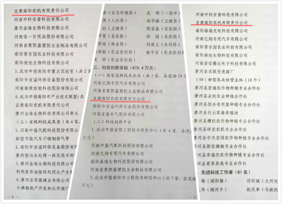 亞澳農機共獲得政府獎勵35萬(wàn)元。包括成功申報國家高新技術(shù)企業(yè)20萬(wàn)元獎勵、市級工程技術(shù)研究中心5萬(wàn)元獎勵、南陽(yáng)市產(chǎn)業(yè)技術(shù)聯(lián)盟10萬(wàn)元獎勵10萬(wàn)元。