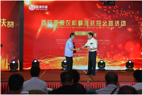 開(kāi)機儀式上,中國農機化協(xié)會(huì )還就“甘肅省蘭州市永登縣”精準扶貧工作給予亞澳高度的認可。永登縣團莊村屬干旱貧困山區,全村現有7個(gè)村民小組,421戶(hù)、1696人。近年來(lái),幫扶單位先后捐贈了30多臺(套)特色農機具,但仍缺少大中型農機具,農機化服務(wù)能力不足,不能滿(mǎn)足農業(yè)生產(chǎn)需求。此次中國農業(yè)機械化協(xié)會(huì )聯(lián)合亞澳公司等有關(guān)單位向團莊村捐贈價(jià)值40多萬(wàn)元農業(yè)機械,必將對團莊和周邊鄉村農業(yè)和農村經(jīng)濟發(fā)展、全面建設小康社會(huì )起到很大地推進(jìn)作用。