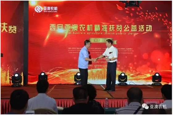 亞澳精準扶貧公益活動(dòng)現場(chǎng),中國農機化協(xié)會(huì )會(huì )長(cháng)劉憲到會(huì )致辭,并給予亞澳頒發(fā)證書(shū)。
